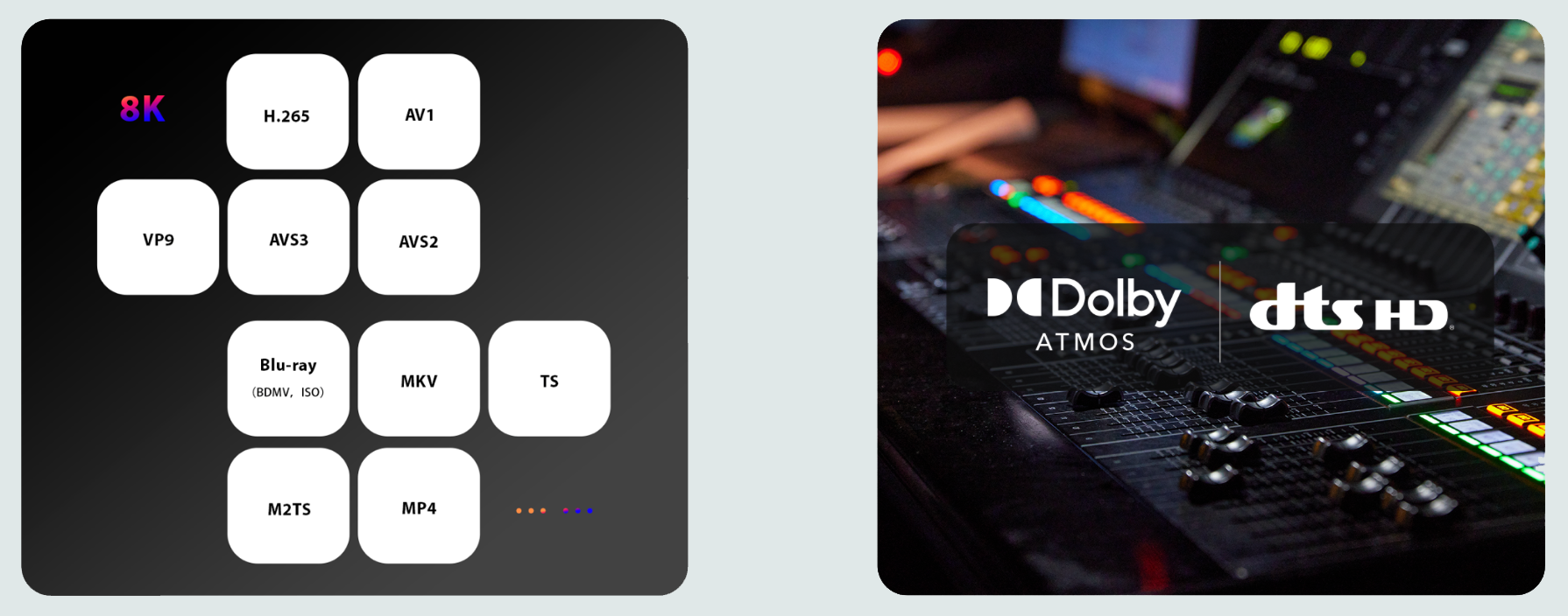 The built-in dorpo Media Player supports all major 8K codecs (H.265, AV1, VP9, AVS3, AVS2) and nearly every media format, including: